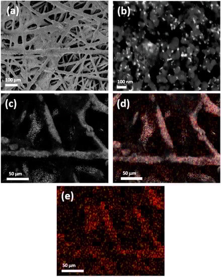 Field emission SEM images of the Bi/C electrode with Bi loading of 0.1 mg cm−2: (a) magnification ×130, and (b) magnification ×100.00 K. Micrographs (c–e) correspond to SEM-EDX mapping: d and e highlight, in red, the distribution of BiNPs on the carbon substrate.