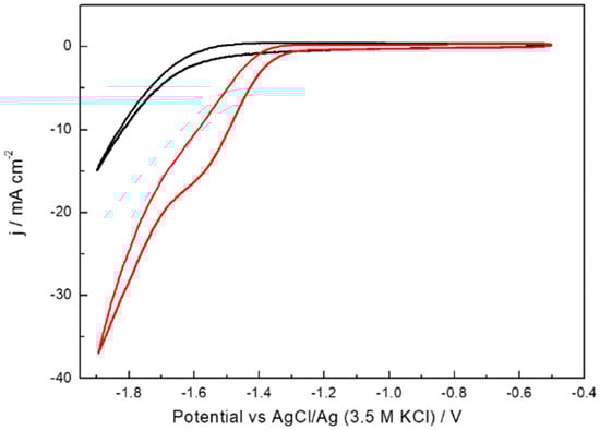 Cyclic voltammetry response of Bi/C electrode with Bi loading of 0.1 mg cm−2 in Ar (black line) and CO2 (red line) saturated 0.5 M KHCO3. Scan rate 50 mV s−1.