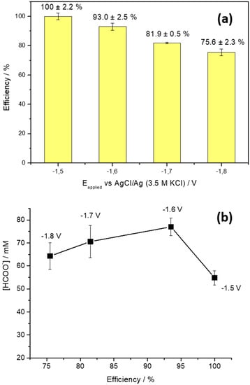 (a) Faradaic efficiency for formate production at different controlled potential from −1.5 to −1.8 V. Electrolysis time: 3 h. (b) Formate concentration produced after 3 h of electrochemical reduction of CO2 at different controlled potentials as a function of Faradaic efficiency.