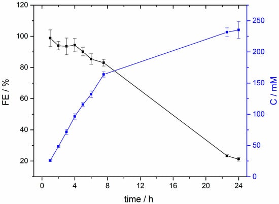 To properly evaluate the stability of the Bi NPs and to find out why the electrode degrades, a long-term (24 h) CO2 reduction experiment was carried out at −1.6 V vs. Ag/AgCl in the same H-type electrochemical cell and with a freshly prepared electrode. As shown in Figure S12, the current remains essentially stable during the first 6–7 h. Nevertheless, from this moment, the currents progressively become more negative. At the same time, a more visible generation of bubbles at the surface of the electrode is also observed thus suggesting that HER is becoming predominant in the process. To verify this hypothesis, Figure 6 reports the evolution of the FE and formate concentration during the 24 h experiment. The results confirm that, after 4–5 h, the electrode begins to be less efficient and both FE and formate concentration clearly decay. In particular, the FE decreases from 90–95% (after 5 h) to about only 20% after 24 h. A similar deactivation is progressively observed in term of formate concentration. Thus, whereas in the first 5 h the formate concentration is increasing in about 23 mM/h, this production is significantly reduced to about 6 mM/h during the remaining 19 h. These preliminary results indicate that the Bi electrode strongly deactivates under working conditions. As deduced from the SEM images, Figure 5, this deactivation is attributed to a gradual loss of Bi. This Bi detachment suggests an insufficient interaction between the Bi NPs and the carbon Vulcan substrate. In any case, more work is in progress not only to better understand the mechanism of degradation of the Bi electrodes but also to find new alternatives to improve their durability under working conditions.