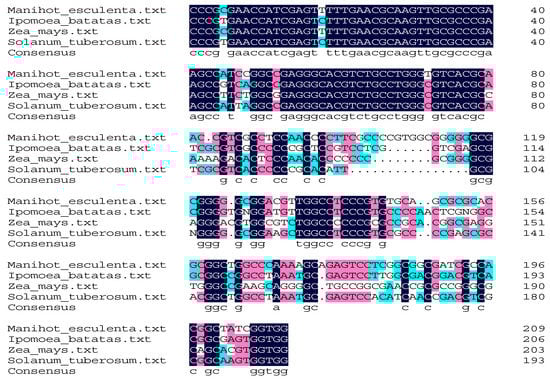The alignment of the target sequences from Manihot esculenta with the corresponding sequences of Ipomoea batatas, Zea mays, and Solanum tuberosum.