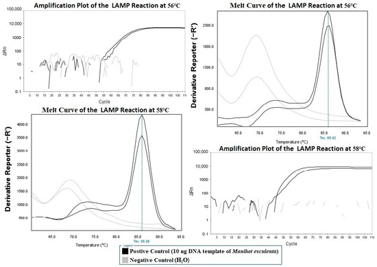 The LAMP reaction with the newly designed primers was carried out at 56 °C and 58 °C for 60 min, and as shown in Figure 2, it resulted in the amplification of all positive controls (DNA from Manihot esculenta) along with negative results for all negative control (water only) reactions. Given the amplification efficiency and specificity, 58 °C was chosen as the most suitable reaction temperature.