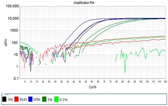 The detection limit of the real-time LAMP Assay. 10%: DNA extracted from sweet potato starch containing 10% cassava starch; 5%: DNA extracted from sweet potato starch containing 5% cassava starch; 1%: DNA extracted from sweet potato starch containing 1% cassava starch; and 0.1%: DNA extracted from sweet potato starch containing 0.1% cassava starch.