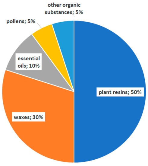 Propolis is a mixture of substances used by bees to defend the hive. This protection concerns filling cavities in the walls of the hive, reducing the entrance during cold days, and also mummifying the demanded intruders, thus preventing their decay []. This explains why propolis is also known as bee glue []. The word, propolis, is Greek in origin and means at the entrance to the city [,]. Discussions on the origin of propolis have been continuing since ancient times. Doubts have arisen about whether its origin comes from plants or bees. Nowadays, with the development of analytical techniques, the approximate composition of propolis and the factors influencing it are known [].