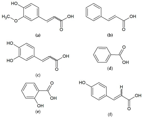 Aromatic acids present in propolis: (a) ferulic acid; (b) cinnamic acid; (c) caffeic acid; (d) benzoic acid; (e) salicylic acid; (f) p-cumaric acid.
