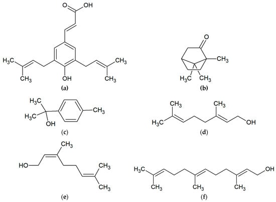 Polyphenols and terpenoids are also considered to be the most active []. The flavonoid group includes chrysin, pinocembrin, apigenin, galangin, kaempferol, quercetin, tectochrysin, pinostrobin and others (Figure 2). Another critical group of compounds of propolis are aromatic acids, among which the most often occur in ferulic, cinnamic, caffeic, benzoic, salicylic and p-cumaric acids (Figure 3) [,,]. In Polish propolis, the content of flavonoid compounds ranged from 6.2 to 18.8%. Among the flavonoids, the highest amounts were pinocembrin (mean 4.7%), pinobenchin (mean 3.1%), galangin (mean 2.2%) and chrysin (mean 2.1%) []. In addition, propolis also includes other phenolic compounds (e.g., artepillin C), and terpenes (terpineol, camphor, geraniol, nerol, farnesol) which are responsible for its characteristic fragrance (Figure 4). In propolis, micro and macroelements (Mn, Fe, Si, Mg, Zn, Se, Ca, K, Na, Cu) and vitamins B1, B2, B6, C and E can be found [,,,,,,]. This diversity of the chemical composition gives propolis an additional advantage as an antibacterial agent. The combination of many active ingredients and their presence in various proportions prevents the bacterial resistance from occurring [].