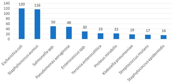 The antibacterial activity of propolis is most often tested on E. coli, S. aureus, Salmonella spp. and P. aeruginosa. The ten most frequently analyzed bacteria are shown in Figure 6.