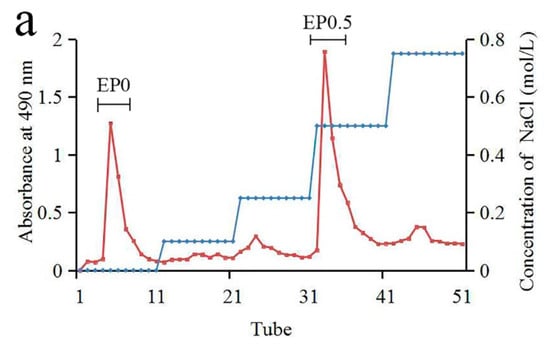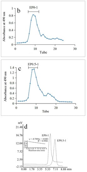Our previous data indicated that the concentration of polysaccharides in infected leaves was increased and they could contain large amounts of exopolysaccharides. To explore the use of infected leaves as a functional product, the exopolysaccharides must inevitably be considered. To study the exopolysaccharides individually, the fungus E. gracile was isolated from C. oleifera, purified and used in fermentation. The yield of the crude polysaccharide from the fermentation broth of E. gracile was 4.53%. The crude polysaccharides were fractionated by anion exchange chromatography through a Q Sepharose Fast Flow column (Figure 1a). The major fractions eluted by water and 0.5 mol/L NaCl were further purified on a Sephacryl S-200 column and named as EP0-1 and EP0.5-1, respectively (Figure 1b,c). The yield of EP0-1 from crude polysaccharide was approximately 45% and that of EP0.5-1 was approximately 30%.