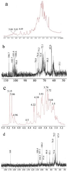 Figure 3 shows the 1H- and 13C-NMR spectra of EP0-1 and EP0.5-1. The chemical shifts of the major signals were assigned according to reference data from similar sugar residues. The 1H spectrum of EP0-1 revealed that is a complex polysaccharide, evidenced by the presence of many signals in the anomeric region. The 13C-NMR spectrum of EP0-1 provided more characterization information. The signals at 106.7 ppm are suggested to be the anomeric carbon of (1→5)-β-d-galactofuranose due to their extremely low field shifts. The other anomeric signals were less than 103 ppm. The signals at approximately 102.7 ppm could be C1 of terminal β-GlcN and →6)-α-d-Manp(1→ []. The signal at 4.6 ppm from the 1H spectrum should be the anomeric proton of terminal β-GlcN(1→ []. The signal at 55.1 ppm was assigned to the C2 of GlcN, which is linked to the amino group. The signal at approximately 100.6 ppm was assigned to the C1 of →2)Manp(1→ []. The signal at 78.8 ppm was assigned to the substituted C2 of →2)-α-d-Manp(1→.