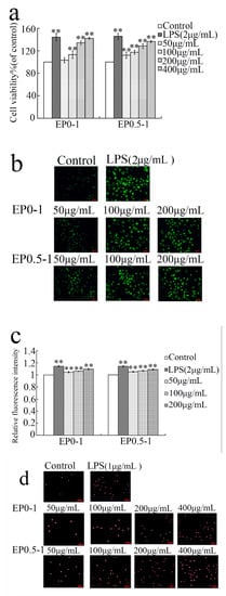 Reactive oxygen species (ROS) are produced by the activation of macrophages and are an important molecule in signaling pathways that are involved in the immune response. ROS plays a positive role in preventing and killing microbial invasion and tumor genesis []. The production of ROS can be measured using the fluorescent probe DCFH-DA. The cell was probed with DCFH-DA after treated with different concentrations of LPS, EP0-1 and EP0.5-1 for 24 h. The mean fluorescence intensity of DCF in LPS, EP0-1 and EP0.5-1 treated cells was significantly greater than the control, based on fluorescence microscopy results (Figure 4b). This result demonstrated that the cells treated with EP0-1 and EP0.5-1 in the concentration range of 50–200 μg/mL displayed up-regulation of intracellular ROS production (Figure 4c).
