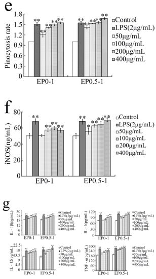 After treatment with different concentrations of LPS, EP0-1 and EP0.5-1 for 24 h, cells were assessed for viability using an MTT assay. The viability effects of LPS, EP0-1 and EP0.5-1 on RAW 264.7 cells are shown in Figure 4a. EP0-1 and EP0.5-1 were not cytotoxic to RAW264.7 cells. Compared with the control, EP0-1 had significant proliferation activity at the concentration range of 100–400 μg/mL. At the concentration range of 50–400 μg/mL, EP0.5-1 significantly promoted the proliferation rate of macrophages.