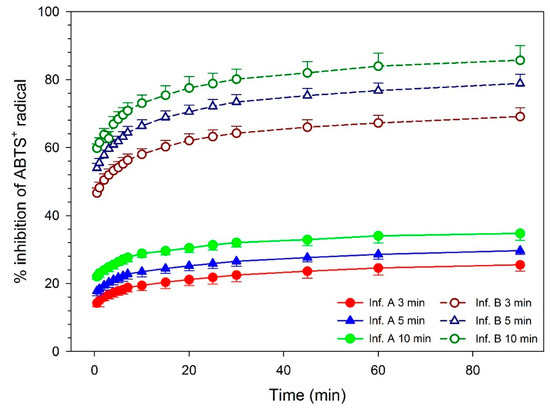 Inhibition percentages versus time for infusions A and B after 3, 5, and 10 min of contact plant-water contact are provided in Figure 1. As shown in the figure, the longer the time of the infusion, the higher inhibition capacity and, consequently, the higher the antioxidant activity. Accordingly, in infusion A samples, an initial inhibition percentage of 14.24% was obtained with 3 min of infusion; 17.76% after an infusion time of 5 min; and 22.04% with 10 min. With infusion B samples, an initial inhibition percentage of 46.62% was calculated for an infusion time of 3 min, 53.97% with 5 min, and 59.81% with 10 min.