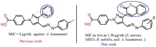 Coumarin derivatives are well-known oxygenated fused bicyclic molecules. These molecules are known for their wide range of biological activities [,,] including activity against Gram-positive [] bacteria (S. aureus, [] Bacillus subtilis [,]) and Gram-negative [] (E. coli, [,] P. aeruginosa [] and other bacterial species []). Coumarin derivatives as anti-A. baumannii agents are rare []. Pyrazole derivatives are another class of pharmacologically important molecules known for their wide range of therapeutic properties including antimicrobial activities [,,]. Likewise, hydrazone derivatives are known for their wide range of biological activities including antibacterial properties; e.g., rifampicin, an approved drug to treat tuberculosis [,].