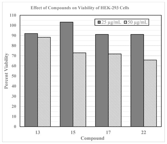 Active molecules were tested against a human embryonic kidney (HEK293) cell line at 25 µg/mL and 50 µg/mL concentrations for in vitro toxicity studies (Figure 2). Potent compounds (15 and 17) did not show any significant cytotoxicity at 25 µg/mL concentration. All of the synthesized compounds were submitted to the National Cancer Institute (NCI) for cytotoxicity studies. None of the compounds showed any significant cytotoxicity against NCI-60 cancer cell lines. Thus, these compounds are non-toxic to mammalian cell lines.
