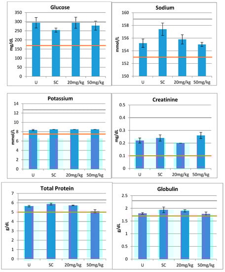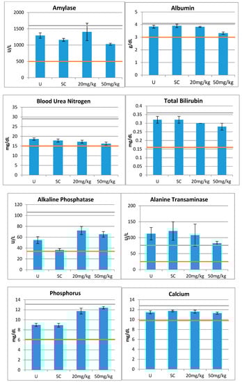 In vivo toxicity of compound 15. Two doses (20 and 50 mg/kg) were administered IP in CD-1 mice (n = 5 for each dose). Blood samples were collected 24 hours later and tested by 14 parameters for organ functions. The orange and green lines indicate the normal ranges for the assays. U = Untreated and SC = Saline Control.