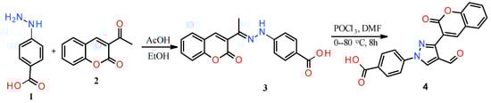 A mixture of 4-hydrazinobenzoic acid hydrochloride (1, 1.980 g, 10.5 mmol), 3-acetylcoumarin (1.881 g, 10 mmol), and sodium acetate (0.82 g, 10 mmol) in ethanol. Ethanol was evaporated under reduced pressure and the hydrazone derivative was dried in vacuum. The dried material was subjected to further reaction without isolation or purification. The coumarin-derived hydrazone was dissolved in anhydrous N,N-dimethyl formamide (30 mL) and sealed by a rubber septum. The solution was cooled under ice for ~10 min, followed by the dropwise addition of phosphorous oxychloride (POCl3, 4.67 mL, 50 mmol). The reaction mixture was brought to room temperature and heated 80 °C for eight hours. After completion of the reaction, the reaction mixture was poured onto ice and was stirred for 12 h. The solid product was filtered and washed with water repeatedly followed by drying the product under vacuum to get the pure product in a very good overall yield [,,].