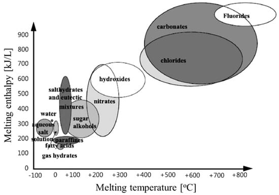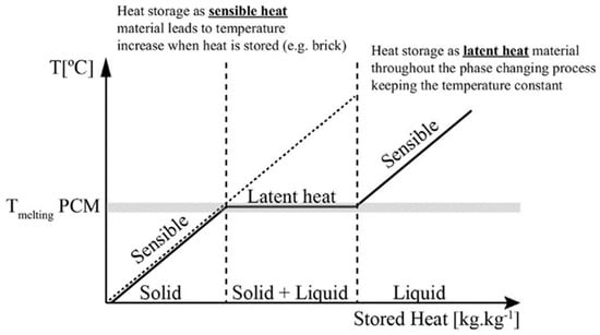 where C is the heat capacity, m is the mass of the material, c is the specific heat of the material, and ΔT is the difference between the final and initial temperatures. Different materials have different heat capacities C, which causes sensible heat to be affected by material properties and application temperatures []. Latent heat is another means of storing thermal energy. This method utilizes a material phase-change process to store thermal energy as potential energy. Usually, PCMs undergo a volume change of less than 10% during the phase change process [].
