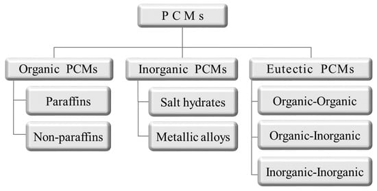Over the last several decades, many studies have been conducted on energy storage materials, including hydrated salts, paraffins, fatty acids, and eutectic mixtures of organic and inorganic compounds (see Figure 2) []. According to their composition, energy storage materials are divided into two categories: organic and inorganic. These two categories can be further divided into two subcategories based on eutectic and mixed temperature ranges (see Figure 3) [,,,].