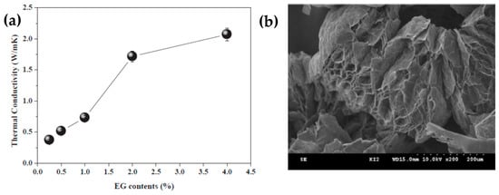 (a) Thermal conductivities of the erythritol/expanded graphite composites as a function of the EG content and (b) SEM image of the worm-like and porous EG.