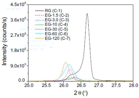 X-ray diffraction patterns of the RG (C-1) and EGs as a function of the heat treatment time (C-2 to C-7).