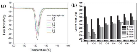 Shin et al. [] prepared an erythritol and exfoliated graphite composite using an impregnation method, which effectively improved the thermal conductivity and thermal cycle stability of erythritol. Composites containing 4 wt% exfoliated graphite exhibited the best thermal performance in the tested SSPCMs, considerably improving the thermal conductivity and thermal cycling stability of 2.06 W/mK (Figure 4a). However, the melting point of the composite material was slightly reduced. After multiple melt-coagulation cycles, the initial latent heat of the composite material was the lowest, but the insect-like morphology and porosity of the EG reduced the heat leakage of the composite material (Figure 4b). Expanded graphite (EG) with different interlayer spacing was combined with molten erythritol using a simple mixed impregnation method to form erythritol/EG PCMs. The effect of the additives on the thermal behavior was investigated for various interlayer distances of EG using the thermal equilibrium technique [].