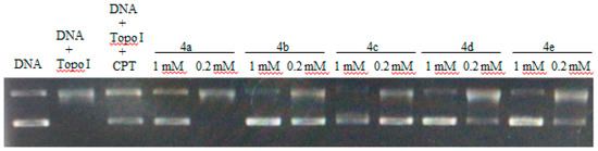DNA-topo I is an important enzyme in all living organisms, and it participates in many cellular metabolic processes, such as replication, transcription, recombination, and repair [19]. DNA topoisomerases have been established as molecular targets of anticancer drugs. The topo I inhibitory activity assay was carried out using the supercoiled DNA unwinding method [20]. A quantitative assay was carried out to assess the relative topo I inhibitory potency of the compounds and compared with the known topo I inhibitor camptothecin (CPT). The topo I inhibitory activity of the compounds is depicted in Figure 2. Similar to CPT, compounds 4b, 4d and 4e showed topo I inhibitory activity at 0.2 mM concentration. Compound 4a showed significant topo I inhibitory activity only at 1 mM. In many cases, the topo I inhibitory activity did not correlate well with the cytotoxicity. Compound 4d showed potent cytotoxicity in most of the cell lines but moderate topo 1 inhibitory activity, which may be related to other anticancer mechanisms.