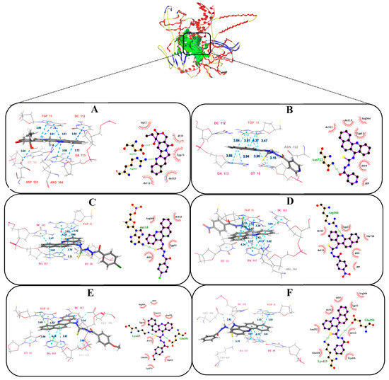 The best pose of the binding mode of compounds with DNA-Topo I complex (PDB:1T8I). (A: CPT, B: 4a, C: 4b, D: 4c, E: 4d F: 4e).