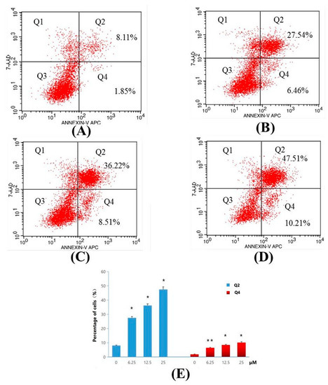 Apoptosis ratio detection of Compound 4d by Annexin V/PI assay. (A) Not treated with Compound 4d (control) for 48 h and, (B) treatment with Compound 4d at 6.25 μM, (C) treatment with Compound 4d at 12.50 μM and (D) treatment with Compound 4d at 25 μM for 48 h each, respectively, (E) The percentage of quadrants Q2 and Q4 was shown as mean ± SD. Data is the representative of three independent experiments. * p < 0.05, ** p < 0.01.