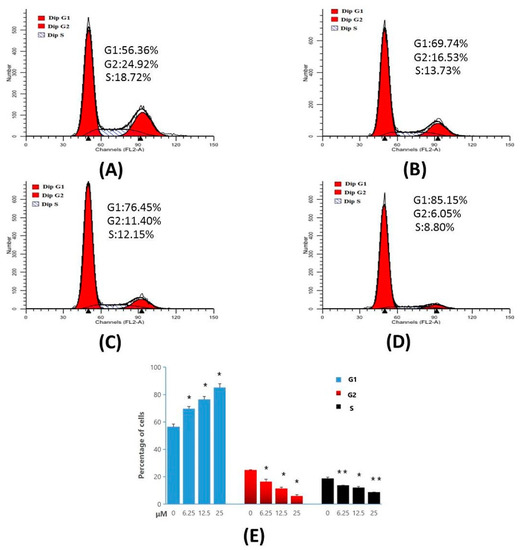 Cell-cycle analysis of MT-4 cells treated with Compound 4d, by flow cytometry. (A) Not treated with Compound 4d (control) for 48 h (B) treatment with Compound 4d at 6.25 μM, (C) treatment with Compound 4d at 12.50 μM and, (D) treatment with Compound 4d at 25 μM for 48 h each, respectively, (E) The percentage of each population was shown as mean ± SD. Data is the representative of three independent experiments. * p < 0.05, ** p < 0.01.