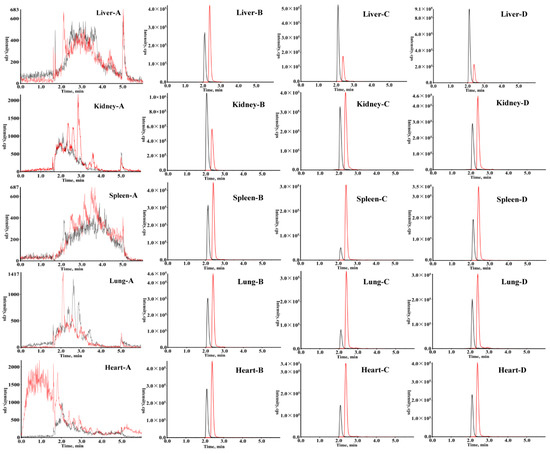 After intravenous administration, HCPT rapidly accumulated in the liver, followed by the kidneys, spleen, lungs and, to the least extent, the heart. The tissue distribution of HCPT and pharmacokinetic parameters are presented in Figure 2 and Table 4. Except for the kidneys, the AUC and MRT of HCPT in the liver, spleen, lungs and heart increased when HCPT was combined with JGGC, while CLz decreased significantly (p < 0.05, p < 0.01), indicating that JGGC enhanced the accumulation of HCPT.