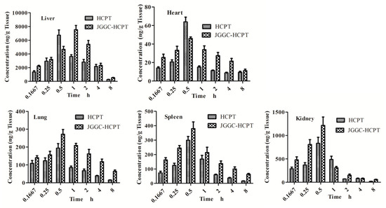 The effect of JGGC on the accumulation and distribution of HCPT was investigated in vivo. All experimental animal procedures and treatments were conducted strictly in accordance with the Guide for the Care and Use of Laboratory Animals, and approved by the Experimental Animal Ethics Committee of the Jiangxi University of Traditional Chinese Medicine (Permit No. SYXK (Gai)-2017-0004). Male C57BL/6J mice (20 ± 2 g) were obtained from the Laboratory Animal Center of Hunan Silaikejingda Experimental Animal Co. Ltd. All animals were housed in an environmentally-controlled room at 25 °C with a 12 h light/dark cycle for at least one week before the start of experimentation. Prior to each experiment, the mice were fasted for 12 h with free access to water. In the tissue distribution study, 84 mice were randomly assigned to either an HCPT or JGGC-HCPT group. The HCPT group received 3.9 mg/kg HCPT intravenously by tail vein injection, while the JGGC-HCPT group received HCPT intravenously 2 h after JGGC.
