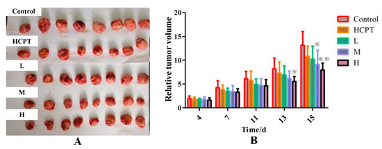 Effect of single or combination of JGGC with HCPT on the tumor growth of Lewis lung carcinoma mice. The photo of tumor collected from different groups of mice at the end of treatment (day 16) (A). Relative tumor volume of different groups of mice (B). Data are shown as mean ± SD, n = 10. ※ p < 0.05, ※※ p < 0.01 vs. control. L represents low dose group [HCPT (3.9 mg/kg) + JGGC (1.3 g/kg)], M represents medium dose group [HCPT (3.9 mg/kg) + JGGC (2.6 g/kg)], and H represents high dose group [HCPT (3.9 mg/kg) + JGGC (5.2 g/kg)].