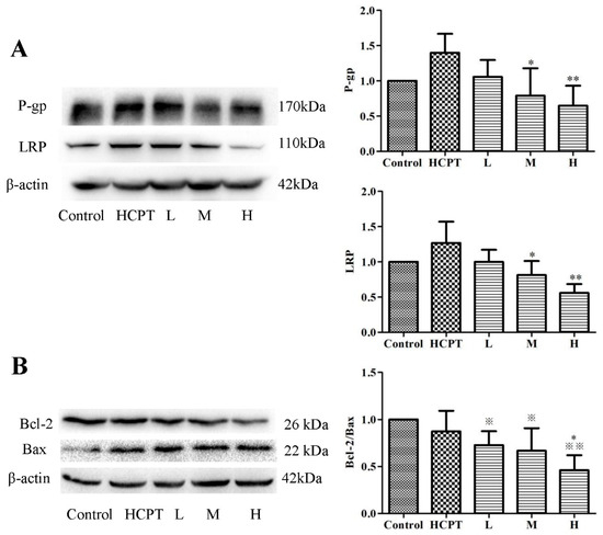 Effect of combination of JGGC on the protein express of LRP and P-gp (A) and the protein express of Bcl-2 and Bax (B). Data are shown as mean ± SD, n = 3. ※ p < 0.05, ※※ p < 0.01 vs. control; * p < 0.05, ** p < 0.01, vs. HCPT.
