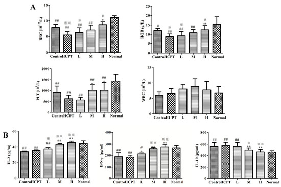 Combination of JGGC and HCPT on the routine blood (WBCs, RBCs, HGB, and PLTs) (A) and immune cytokine (IL-2, IL-10, and IFN-γ) (B) of Lewis lung carcinoma mice. Data are shown as mean ± SD, n = 10. # p < 0.05, ## p < 0.01 vs. normal; ※ p < 0.05, ※※ p < 0.01 vs. control; * p < 0.05, ** p < 0.01, vs. HCPT.