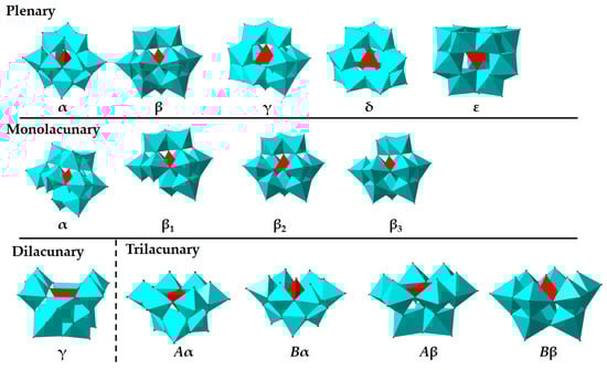 Isomers and mono- to trilacunary derivatives of the Keggin structure; color code: MO6 octahedron, light blue; XO4 tetrahedron, red (X = central atom).