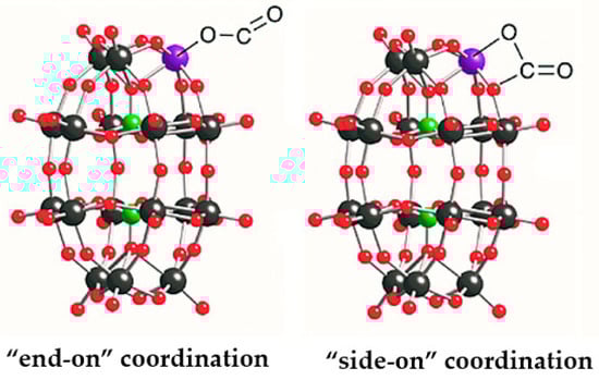 As early as 1988, Kozik and co-workers first reported the coordination of CO2 with several POM derivatives [16]. Afterwards more researches about the interaction of POMs with CO2 emerged [17,18,19,20,21,22]. Since the interaction between CO2 and POM is one of the crucial steps for catalytic transformations of CO2, it is necessary to clarify the mode of such interaction. However, considering the facts that CO2 can be transformed to or with water and this transformation is both reversible and temperature-dependent, the explicit “real” form of dissolved CO2 to interact with POM catalyst, was challenging to be justified. POMs displayed variable interacting modes. 13C NMR, UV/vis, IR with isotope-labelled CO2 (13CO2 and C18O2), and X-ray crystallography are useful tools to solve this issue. As pointed in the seminal report of Kozik et al. [16], the IR spectra and thermochromic behavior of POM α-[SiW11O39Co]6− in the presence of either or was in contrast to the scenario with CO2. On 13C NMR spectra, the 13C chemical shifts of aqueous CO2, , and are respectively at 125, 160, and 162 ppm. After bubbling CO2 into hydrous toluene solution of α-[SiW11O39Co]6−, the appearance of two signals at 792 and 596 ppm demonstrated the presence of two different kinds of paramagnetic CO2 species. In their report, two patterns were suggested on the basis of all 13C NMR, IR observations: (i) the complexation between α-[SiW11O39Co]6− and CO2 was either via CO2 complexes with a direct η1 metal-carbon bond or bicarbonate complexes; (ii) the existence of H-bonding in the CO2 complexes was plausible. Other modes of POM-CO2 or POM- interaction were also discovered. Hill et al. reported the sandwich-type encapsulation of via forming [(YOH2)3(CO3)(A-α-PW9O34)2]11− [20]. [SiMo11CoO38(CO2)]n polymeric chains reported by Xu et al. displayed the μ-η1,η1-OCO linear coordination mode of POM-CO2 interaction [21]. Two kinds of POM-CO2 interaction modes were observed on [(n-C8H17)4N]8[α2-P2W17O61Zn-(CO2)] [21]. The stronger “side-on” binding of CO2 by is predominant at higher temperatures (room temperature down to ca. 250 K) and the more weakly coordinated “end-on” POM-Zn-O-C-O structures were observable at lower temperatures (Figure 2). One particular case was uptaking 30 CO2 molecules by one capsule of [{(MoVI) O21(H2O)6}12{ O4(CH3COO)}30]42−. In this case, CO2 reacted directly with the H2O ligands in { O4(H2O)2}2+ linkers to generate at pH 7. Then the uptake of 30 CO2 molecules was realized via the fast exchange of acetate by carbonate ligands [22]. Above cases indicated the abundance of POM-CO2 interaction mode.