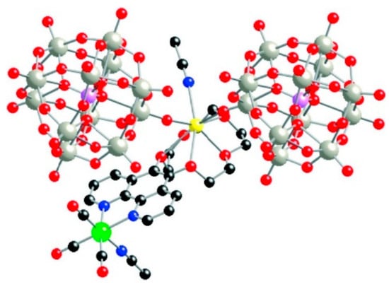 ReI(L)(CO)3-NaHPW12O40 presenting the complexation of two [PW12O40]3− units to Na. H atoms and solvent molecules are omitted. C, black ball; N, blue ball; O, red ball; P, purple ball; Na, yellow ball; Re, green ball; W, gray ball. Reprinted with permission from [41]. Copyright© 2011 American Chemical Society.