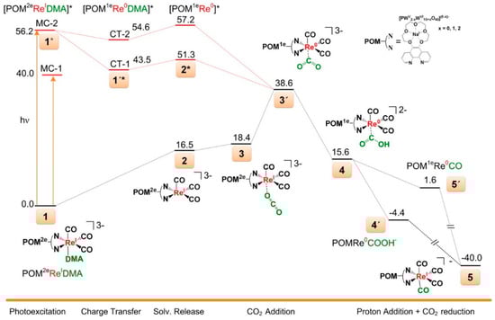 The TD-DFT calculations disclosed a more detailed mechanism for the photoreduction of CO2 to CO with this POM-ReI complex catalyst [42]. Simulated absorption spectrum of ReI-POM complex was calculated at different functional level (i.e., X3LYP, M06X, B3LYP, and CAMB3LYP) and the computed results were found to be basically consistent with the experimental absorption spectrum (two major bands with maxima at 500 and 656 nm). In the ground state without any light irradiation, bonding CO2 with ReI center to afford the reactive POM-ReI- complex had to overcome a high energy barrier (≥38 kcal mol−1), therefore, the direct CO2 reduction with ReI-POM occurred less likely (Figure 5). In the conditions with photoexcitation, the excited ReI-POM was allowed to interact with CO2 to form POM-ReI-. The subsequently protonation and further electron reduction process were exothermic by more than 78 kcal mol−1. These energy profiles revealed that the role of POM as photosensitizer in the reduced state, electron “shuttles” as well as electron/proton reservoirs in this process. Plausible CO2 photoreduction mechanism consists of five steps: (1) photoexcitation and charge transfer; (2) disassociation of solvent molecule; (3) CO2 coordination; (4) proton and electron transfer; and (5) release of CO and recoordination of solvent.