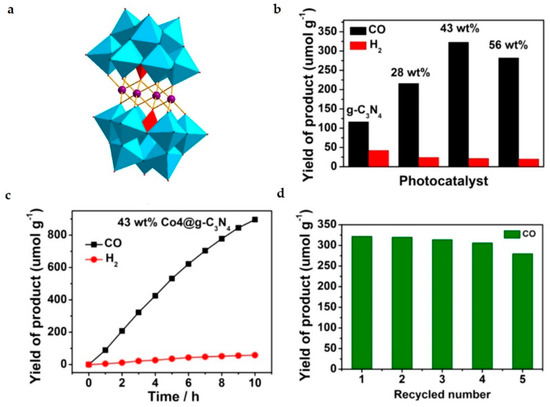 Photocatalytic CO2 reduction by POMs-based heterogeneous catalyst has received intensive research interests. As a POM-stabilized multi–Co-oxide clusters, [Co4(PW9O34)2]10− is comprising a Co4O4 core stabilized by two oxidatively resistant polytungstate ligands (Figure 6a). The Na10[Co4(H2O)2(PW9O34)2 @graphitic carbon nitride hybrid material (Co4@g-C3N4) was reported for the efficient photocatalytic CO2 reduction [44]. It manifested the advantages of convenient recovery, steady reuse, simple preparation and flexible composition. The Co4@g-C3N4 photocatalyst with 43 wt% Co4 content showed high CO yield (107 μmol g−1 h−1) and excellent selectivity (94%) (Figure 6b). After 10 h reaction, the production of CO reached 896 μmol g−1 (Figure 6c). After 5 runs, the activity still remained (Figure 6d). Experimental and characterization results revealed that the Co4 unit both facilitated the charge transfer of g-C3N4 and significantly enhanced the surface catalytic oxidative activity.