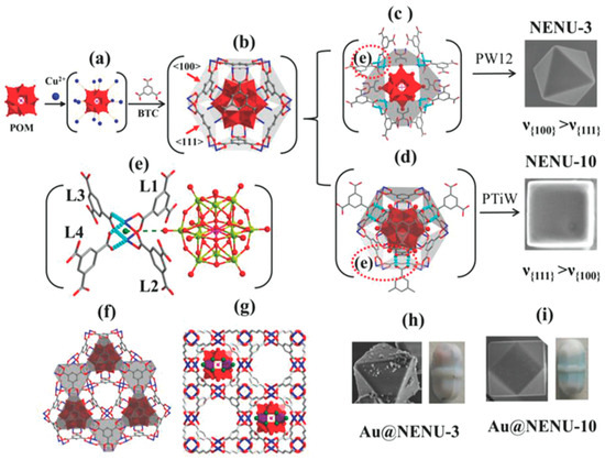 Proposed crystal growth mechanism of Au@NENU-3 and Au@NENU-10. The intermediate of Cu2+ around polyoxometalate (POM) (a). The proposed the basic growing unit consisting of 1 POM, 24 Cu2+, and 8 BTC ligands in which each Cu2 unit coordinates with 2 BTC ligands (b). Eight BTC ligands are needed to coordinate with four Cu2 units when crystal grows along the ⟨100⟩ direction (c). While only six BTC ligands are needed for three Cu2 units along the ⟨111⟩ direction (d). The enlarged diagram of the dashed red circle (e). The exposed surface of the octahedron shape for Au@NENU-3 ({111} plane where [PW12O40]3− is sheltered by BTC (f). The exposed surface of the cube shape for NENU-10 ({100} plane where [PTi2W10O40]7− is exposed wholly) (g). The SEM images for Au@NENU-3 and Au@NENU-10, respectively (h, i). Reprinted with permission from [45]. Copyright © 2018 Wiley-VCH Verlag GmbH and Co. KGaA.