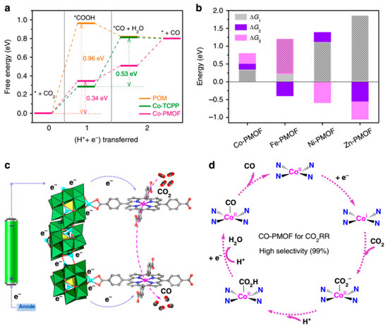 The DFT calculation and proposed reaction mechanism. The free energy diagrams CO2 reduction reaction (CO2RR) for the Zn-ε-Keggin POM, the Co-TCPP metalloporphyrin and the Co-PMOF (a); comparison of the free energy of each elementary reaction (ΔG1, ΔG2, and ΔG3 represent the free energy of * COOH formation, * CO formation, and CO desorption process, respectively) in CO2RR for Co-PMOF, Fe-PMOF, Ni-PMOF, and Zn-PMOF (b); proposed mechanistic scheme for the CO2RR on Co-PMOF (c,d); color code: MoO6 octahedra, bottle green; Zn, light blue ball; Co, magenta ball, N, blue ball; C, grey ball; O, red ball. Reprinted with permission from [58]. Copyright © 2015 Attribution 4.0 International (CC BY 4.0).