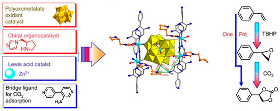 Various important applications of cyclic carbonates make the research on POM or other material-catalyzed synthesis of cyclic carbonates always receive long-lasting interests [80]. By integrating POM components, chiral organic catalysts and CO2 activator in the skeleton of a single MOF, the polyoxometallate-organocatalyst-metal organic framework (POMOF) was designed by Duan group [81]. Chiral cyclic carbonates were produced efficiently from olefins and CO2 on the POMOFs tandem catalyst. By ingeniously connecting Keggin-type POM anions α-[ZnW12O40]6−, l-proline-derived asymmetric organocatalysts pyrrolidine-2-yl-imidazole (PYI) and NH2-functionalized bridging links 2-amino-4,4′-bipyridine via the six-coordinated ZnII nodes in these POMOFs (α-[ZnW12O40]6−-PYIs), a clear division of catalytic working for oxidation-coupled CO2 conversion was established that POM as an oxidation catalyst, pyrrolidine moiety as a chiral organocatalyst, ZnII ions as Lewis acid catalyst to activate the epoxide intermediate and amino groups on 4,4′-bipyridines as renewable CO2 absorption reagent in this tandem process (Figure 16). The multi-catalytic sites were orderly distributed and spatially matched in the framework. The captured CO2 molecules are synergistically fixed and activated by well-positioned pyrrolidine and amine groups, providing further compatibility with the terminal W=O activated epoxidation intermediate and driving the tandem catalytic process in a single workup stage and an asymmetric fashion.
