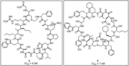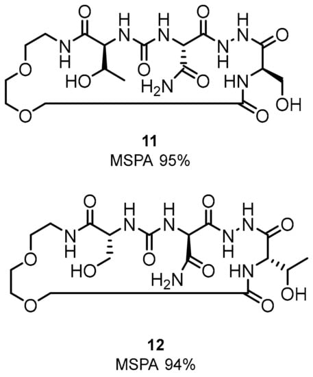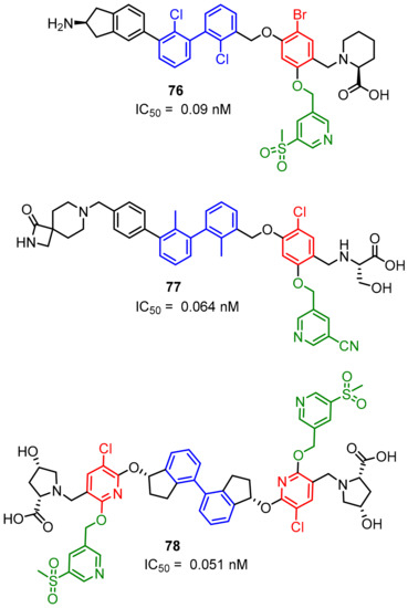 - Magiera-Mularz, K.; Skalniak, L.; Zak, K.M.; Musielak, B.; Rudzinska-Szostak, E.; Berlicki, Ł.; Kocik, J.; Grudnik, P.; Sala, D.; Zarganes-Tzitzikas, T.; et al. Bioactive Macrocyclic Inhibitors of the PD-1/PD-L1 Immune Checkpoint. Angew. Chem. Int. Ed. Engl. 2017, 56, 13732–13735. [Google Scholar] [CrossRef]