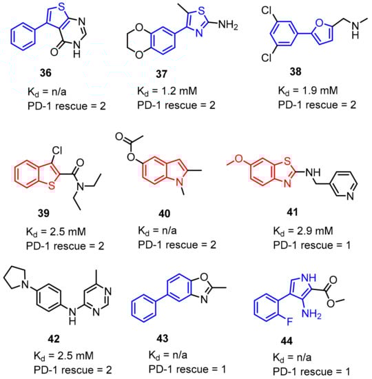 - Perry, E.; Mills, J.J.; Zhao, B.; Wang, F.; Sun, Q.; Christov, P.P.; Tarr, J.C.; Rietz, T.A.; Olejniczak, E.T.; Lee, T.; et al. Fragment-based screening of programmed death ligand 1 (PD-L1). Bioorg. Med. Chem. Lett. 2019, 29, 786–790. [Google Scholar] [CrossRef] [PubMed]