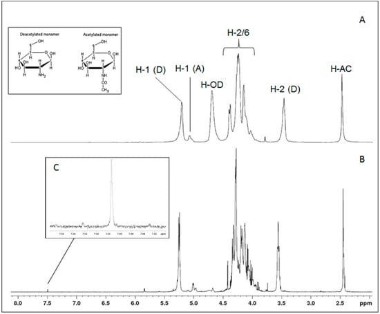 The samples (50 mg) were dissolved in 800 μL of acidified deuterium oxide (D2O). NMR spectra (1H) were obtained in a Bruker Avance III HD 600 MHz spectrometer (Bruker BioSpin Corporation, Billerica, MA, USA) equipped with a 5-mm inverse quadruple resonance probe (QXI) at 70 °C. The chemical shifts were expressed in δ relative to sodium trimethylsilyl propionate (TMSP) at δ = 0.00 in accordance with IUPAC recommendations. For determining the DD sample, we used the integrals of the peaks observed in the anomeric region of 1H-NMR as demonstrated by Lavertu et al. [], which applied to our chitosan. The formula used was: DD (%) = (H1D/(H1D + H1A)) × 100.