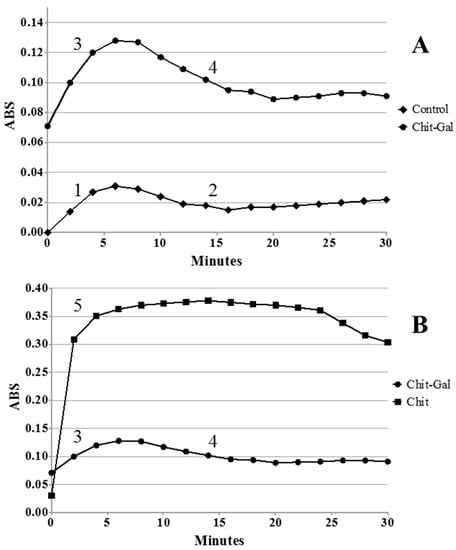 Therefore, we evaluated whether the samples influenced the formation of crystals as well as the phase that is influenced. Figure 3 summarizes the results concerning the formation of CaOx crystals in the presence or absence of Chit or Chit-Gal. In the control group as well as in the presence of Chit-Gal, the two distinct phases of crystal formation were observed: the nucleation/growth (Figure 3A, numbers 1 and 3) and aggregation (Figure 3A, numbers 2 and 4), whereas in the presence of Chit there is only the nucleation/growth phase (Figure 3B, number 5), since the absorbance, after 30 min, does not stabilize. In addition, in the presence of Chit-Gal, a 4-fold increase of the absorbance values was observed when compared to the control, whereas in the presence of Chit, a 10-fold increase in absorbance values were obtained. These results were consistent with those obtained by Queiroz et al. [], who used the same unconjugated Chit used in this study. These authors demonstrated that when the crystals were formed in the presence of Chit, a 15-fold increase in absorbance was observed. In addition, the authors did not observe the aggregation phase until the end of the experiment. This implies, that the addition of only 1% of GA in the Chit structure was enough to decrease its stimulating towards the formation of GA crystals.