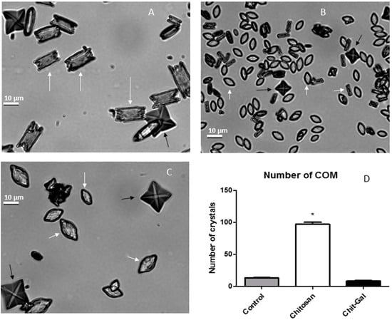 Morphology of crystals formed in the presence and absence of chitosan (Chit). (A) Absence of Chit (Control), (B) Chit, and (C) Chit-Gal. (D) Number of monohydrate crystals (COM) formed by field. White arrows, COM; black Arrows, dihydrate crystals (COD). Scale bar: 10 μm. Different symbols indicate significant difference (p < 0.05).