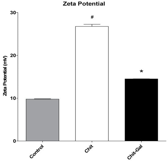 The zeta potential test measures the surface charge of the crystals, allowing the evaluation of how the sample loads influence the total charge of the crystal. The value of the zeta potential of the crystals formed in the presence of the polysaccharides is shown in Figure 5. It can be noted that in the presence of Chit, the zeta potential of the samples increased. This increase, may be related to the fact that Chit is a cationic polymer, mainly due to the positive charge of its amine groups []. Despite this, the increase in the zeta potential observed in the presence of Chit-Gal (14.5 ± 0.1 mV) was lower than that observed with Chit (26.7 ± 0.98 mV), and the zeta potential of the former was close to that of the control condition (9.8 ± 0.14 mV).