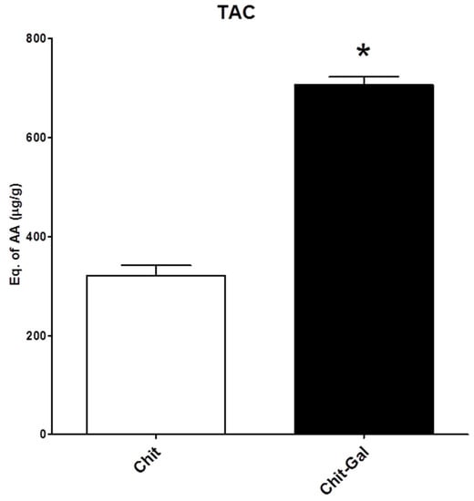 The TAC test measures the ability of a molecule to donate electrons in acid media. Figure 6 shows the total antioxidant capacity of the Chit samples. Chit presented activity at approximately 300 μg ascorbic acid (AA)/g of sample, while Chit-Gal showed higher activity than 600 μg AA/g of sample, indicating that the conjugation of GA to Chit was able to double the TAC of the polysaccharide. These values were low when compared to other molecules, such as sulphated [] and neutral polysaccharides [], where the minimum observed activity was about 10 mg AA/g of sample. However, these results were an improvement over those published by Curcio et al. [], who conjugated GA molecules to Chit, but did not observe an increase in the TAC of the molecule.