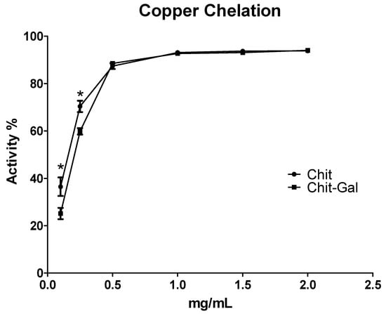 Like iron, copper is also involved in the spread of damage caused by free radicals. Shown in Figure 8 is a comparison of the chelating activities of Chit and Chit-Gal. At low concentrations (up to 0.25 mg/mL), Chit exhibited significantly greater activity than Chit-Gal. At concentrations above this threshold, no significant differences were identified between Chit and Chit-Gal. The activity for both samples was notable and increased in a dose-dependent manner; it increased from 60% chelation at a concentration of 0.25 mg/mL to close to 100% chelation at 1 mg/mL. The relationship between Chit and copper has been widely reported, and the interaction capacity between these molecules has been applied in different ways [,]. However, the activity was different between all Chit molecules. For example, Monteiro and Airoldi [] were unable to obtain copper chelation activities greater than 60%, even at higher concentrations (4 mg/mL) than those used in our study. This shows that the conjugation with GA may be useful to potentiate the chelating action of Chit molecules.